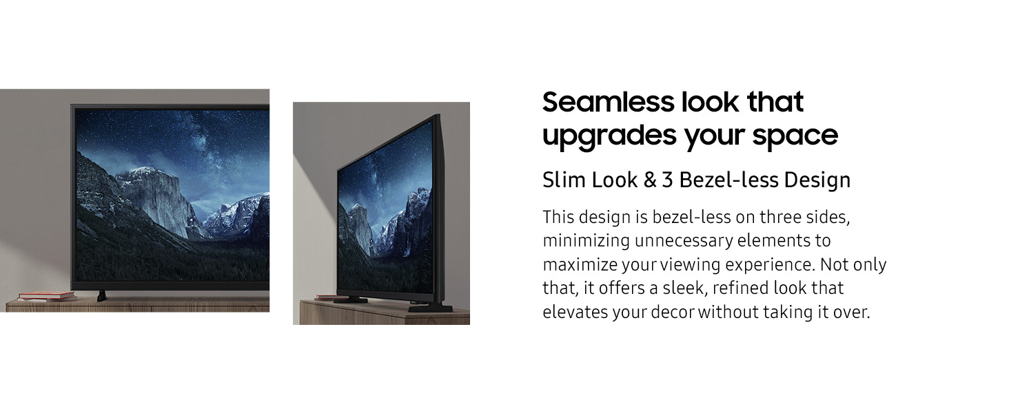 مظهر انسيابي يُضفي لمسة عصرية على مساحتك. هذا التصميم بدون حواف من ثلاث جهات، مما يقلل من العناصر غير الضرورية لتحسين تجربة المشاهدة. ليس هذا فحسب، بل يوفر مظهرًا أنيقًا وراقيًا يرفع من ديكورك دون السيطرة عليه.